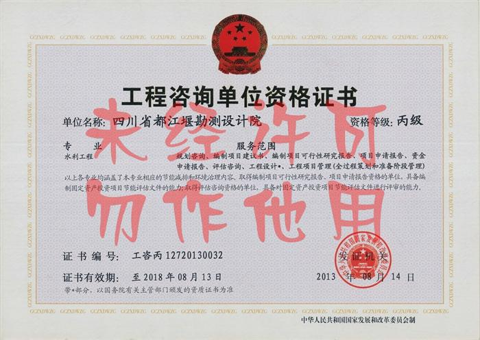四川省都江堰勘測設計院有限責任公司是一家專業從事水利水電工程勘察設計的專業甲級設計院,目前具有水利行業(灌溉排澇)專業甲級、水利行業(引調水、河道整治、城市防洪)專業乙級、電力行業(水力發電(含抽水蓄能、潮汐))專業乙級、市政行業(道路工程、橋梁工程)專業乙級、水利行業(水庫樞紐、圍墾、水土保持)專業丙級設計資質、工程勘察專業類(巖土工程、水文地質、工程測量)乙級資質和水利工程咨詢、項目管理丙級資質,通過了ISO9001:2008質量體系國際標準認證。 通過30多年的發展,公司已經擁有一支愛崗敬業、專業精湛、分工明確、協作配合的專業技術隊伍和高水平的顧問團隊,有完善的組織機構、優秀的管...